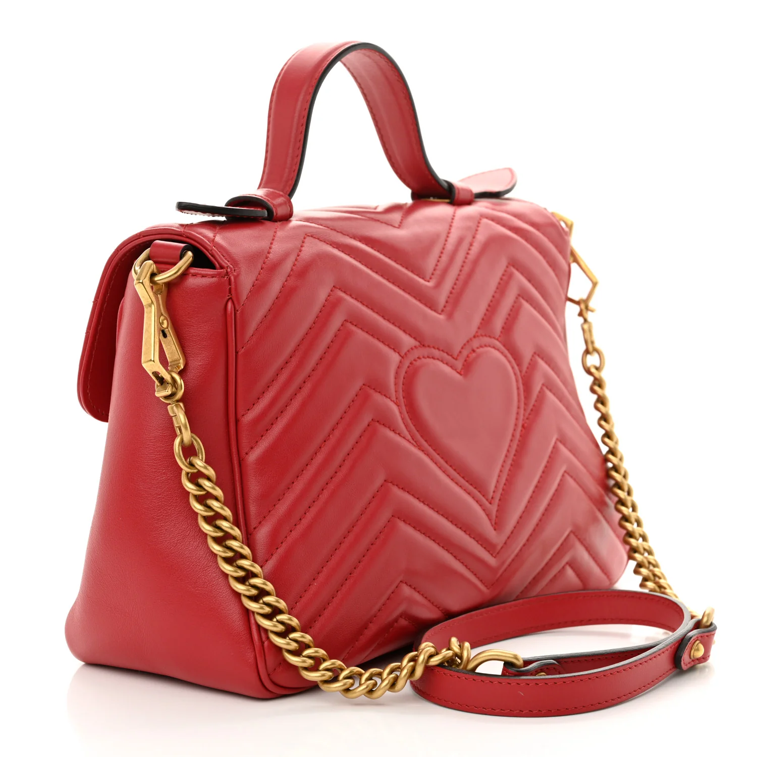 Gucci Calfskin Matelasse Small GG Marmont Top Handle Shoulder Bag Hibiscus Red